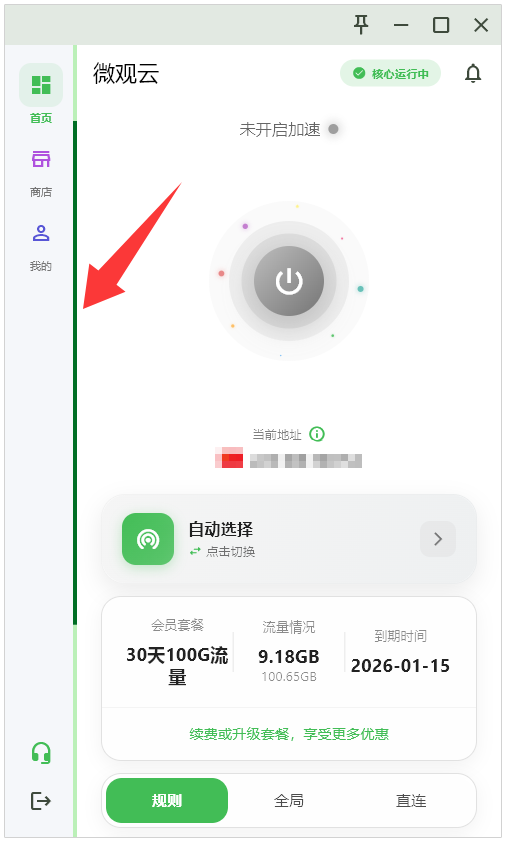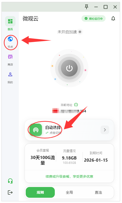 4、选择你需要的节点或者自动选择都可以,点左侧首页,点中间的启动,IP地址会自动检测是否为海外IP