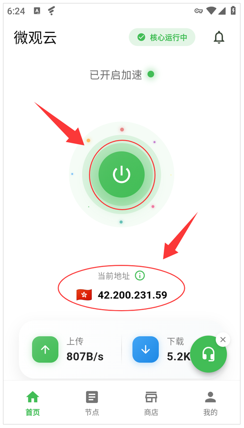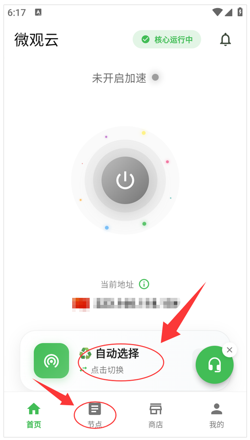3、点软件中的切换节点,或者底部的节点都可以进入到节点列表