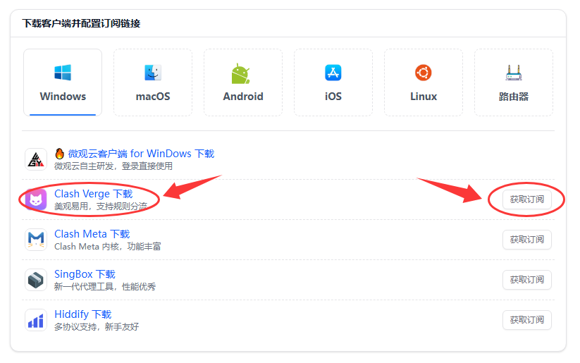 1、登录微观云网站,找到 Clash Verge 点右边的获取订阅