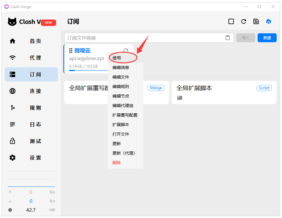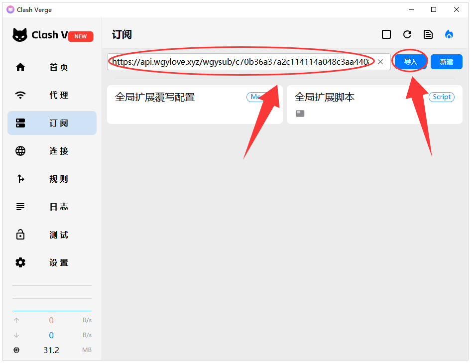 3、打开 Clash Verge,点击订阅 ,将复制的订阅链接粘贴到 订阅文件链接框中,点导入