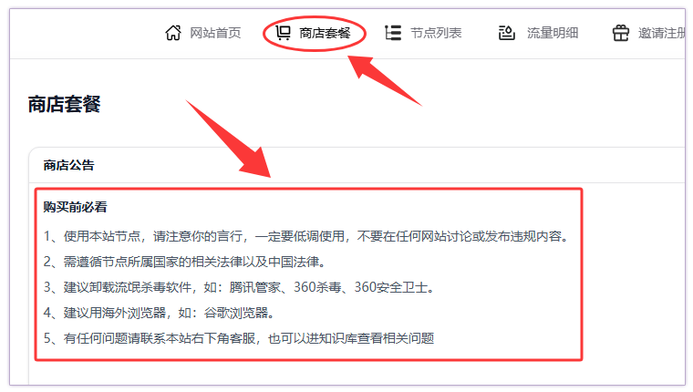3、顶部菜单点击 商店套餐 ,购买前请先仔细阅读 购买协议,避免造成使用问题